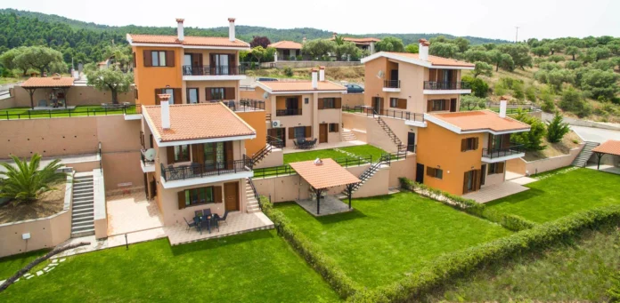 They are situated in a privileged position, as they are built amphitheatrically in an all-green area of 4200mยฒ with a panoramic view of the small islands of the Sigitikos Gulf and the imposing Mount Athos in the background. They are the ideal place for relaxation for everyone seeking exceptional and comfortable accommodation.